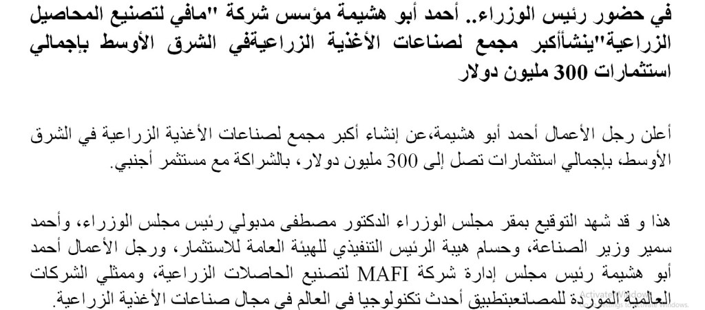 في حضور رئيس الوزراء.. أحمد أبو هشيمة مؤسس شركة “مافي لتصنيع المحاصيل الزراعية”ينشأأكبر مجمع لصناعات الأغذية الزراعيةفي الشرق الأوسط بإجمالي استثمارات 300 مليون دولار Related