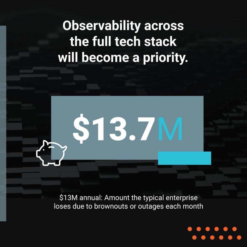 - Observability across the full tech stack will become a priority. According to SolarWinds research, the typical enterprise losesmore than $13M annually to costs associated with the nine brownouts or outages experienced each month. Despite this, nearly half of IT professionals surveyedlack visibilityinto the majority of their organization’s apps and infrastructure. AI-powered observability solutions address this by collecting data to provide information on what’s not performing as expected and why—allowing teams to take a proactive approach to eliminating downtime, innovating, and exceeding customer expectations.