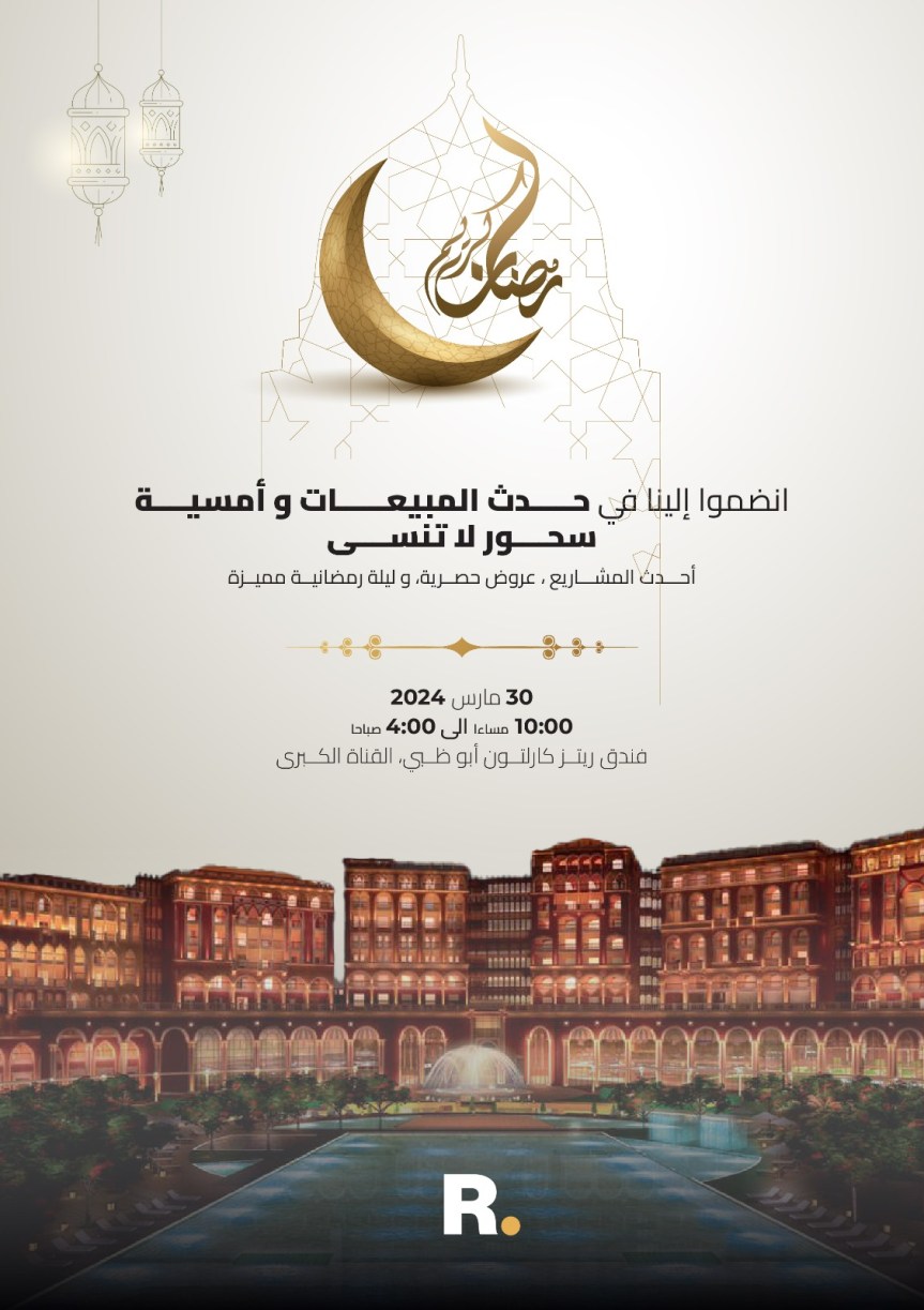 أبوظبي، 29 مارس 2024: تنظم ريبورتاج العقارية، الشركة الرائدة في مجال التطوير العقاري بالإمارات، يوما خاصا للمبيعات وأمسية سحور، في فندق ريتز كارلتون أبوظبي، القناة الكبرى، يوم السبت المقبل، الموافق 30 مارس الحالي.