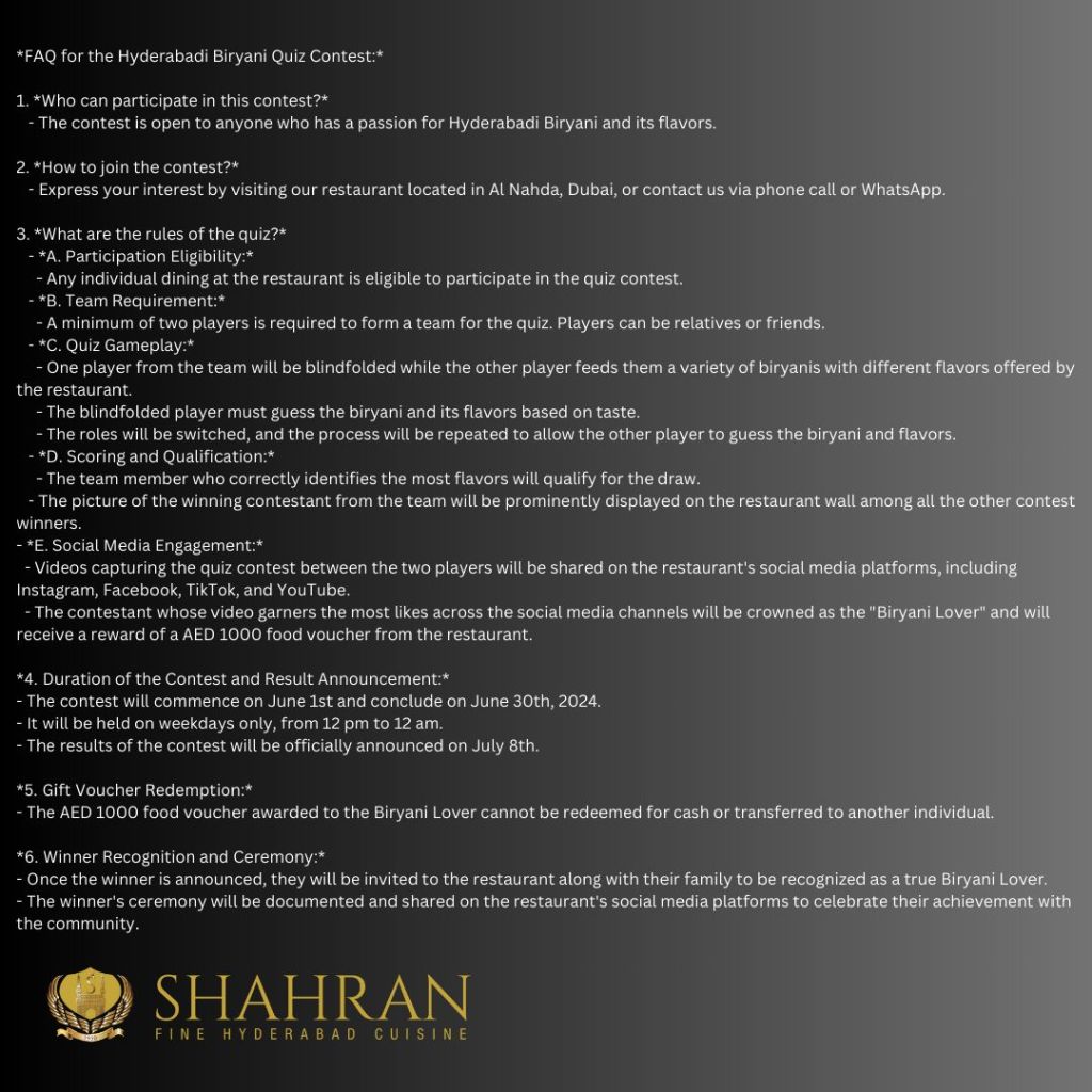 Mr. Shahran Bin Ahmed, Co-founder and CEO of Shahran Restaurant, said that; “We are elated to introduce the Hyderabadi Biryani Quiz Contest to our esteemed patrons. This contest serves as an homage to the rich culinary heritage and intricate flavors of our cuisine. We eagerly anticipate witnessing our customers’ enthusiasm and participation in this unique and interactive culinary journey. At Shahran, our mission is to create indelible experiences, and this contest is a testament to that commitment.”