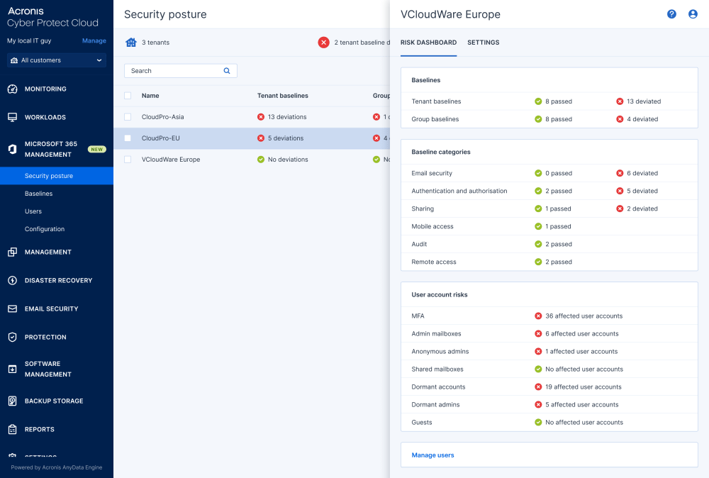 Acronis Ultimate 365 delivers complete Microsoft 365 protection by integrating backup, extended detection and response (XDR), email security, collaboration app security, email archiving, security posture management, and security awareness training into a single, intuitive platform. This approach ensures a secure and resilient Microsoft 365 environment while simplifying management for service providers.