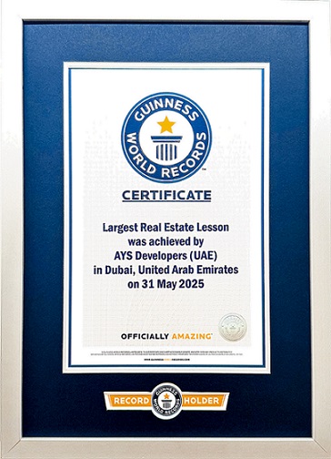 3 June 2025, Dubai, UAE: AYS Developers, one of the region’s fastest-rising names in luxury real estate, has officially made history. AYS Developers, in partnership with Dr. Nour ElSerougy, widely known as the Eagle of Real Estate, Innovation Experts Real Estate Institute, and Al Safi Bank, successfully hosted the world’s largest real estate training session, setting a new Guinness World Record at the Grand Hyatt Conference & Exhibition Centre in Dubai.
