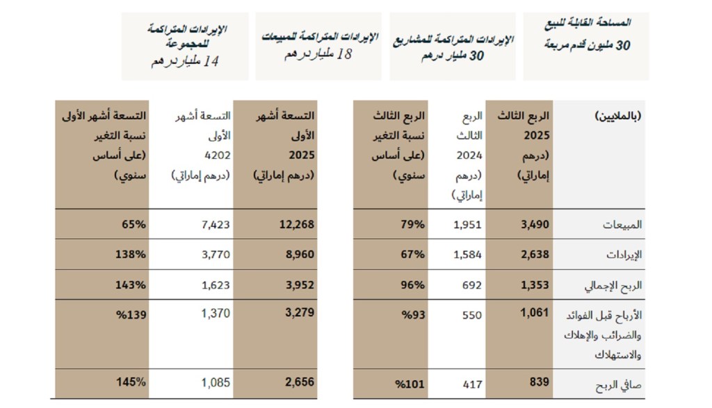 وأطلقت الشركة خلال التسعة أشهر الأولى المنتهية في 30 سبتمبر 2025 إجمالي 11مشروعاً جديداً بقيمة تطويرية إجمالية بلغت نحو 11 مليار درهم، تضم أكثر من 7,000 وحدة سكنية تمتد على مساحة قابلة للبيع تتجاوز 6.0ملايين قدم مربعة.