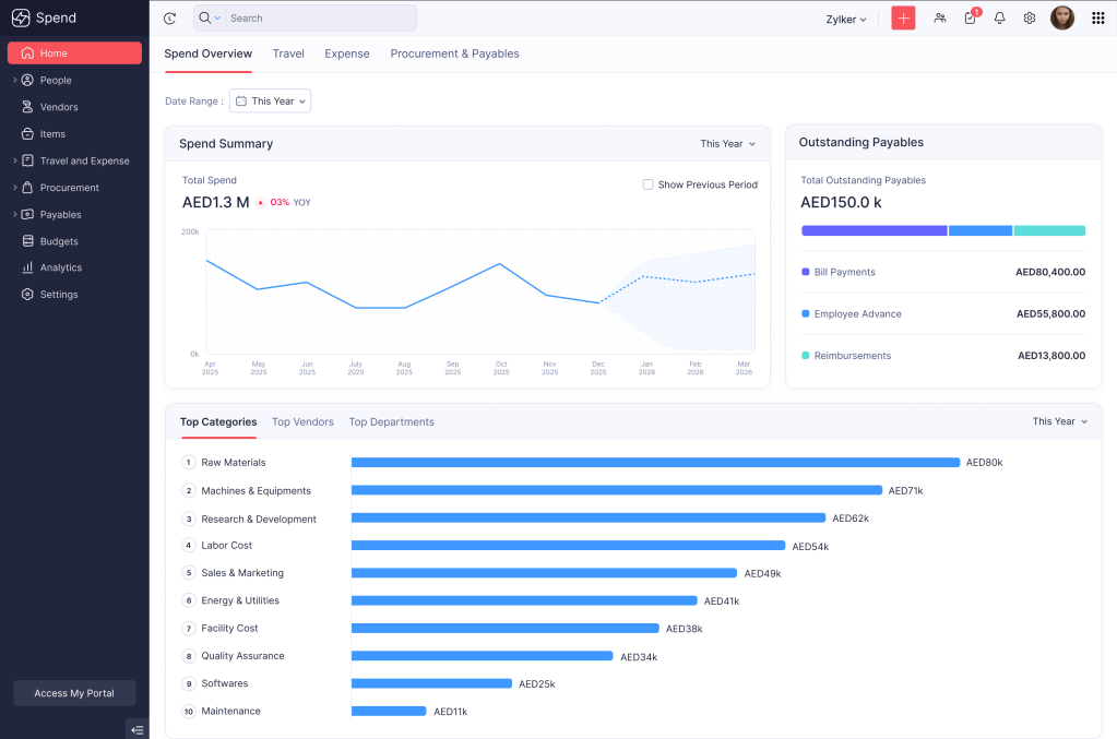 Zoho Spend, an all-in-one solution, unifies every major spend category—payroll, procurement, Accounts Payable (AP) automation, corporate travel, and employee expense—into a single platform, delivering holistic visibility and tighter spend controls. The comprehensive dashboard provides a consolidated view into each of these critical areas, allowing finance and business leaders to take control of their budgets, strengthen governance, and curb maverick spend, turning spend management into a strategic advantage.
