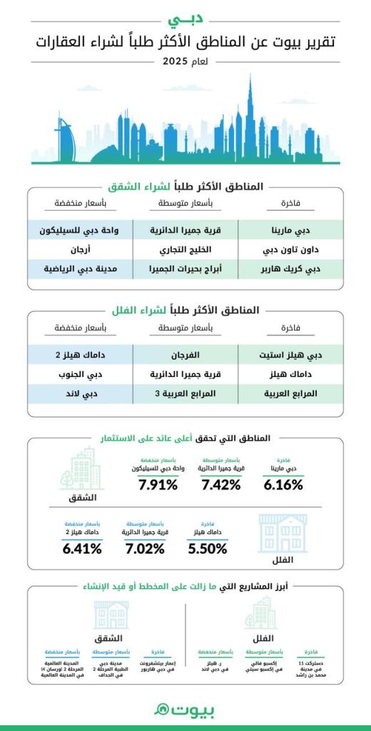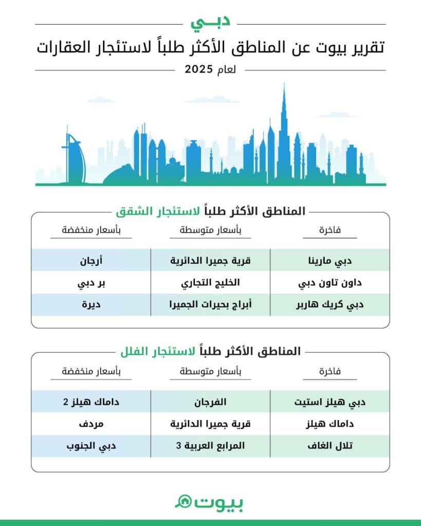وأبدى المستأجرون اهتماماً كبيراً بالشقق المنخفضة في أرجان وبر دبي، بينما حافظت داماك هيلز 2 ومردف على شعبيتهما في قطاع فلل الإيجار المنخفضة. وفي الفئة المتوسطة، تركز الطلب في قرية جميرا الدائرية، الخليج التجاري، الفرجان، والمرابع العربية 3. أما في الفئة الفاخرة، فظلت دبي مارينا ووسط مدينة دبي الوجهات الأكثر طلباً للشقق، فيما واصلت دبي هيلز استيت وداماك هيلز تصدر الطلب على الفلل الفاخرة.
