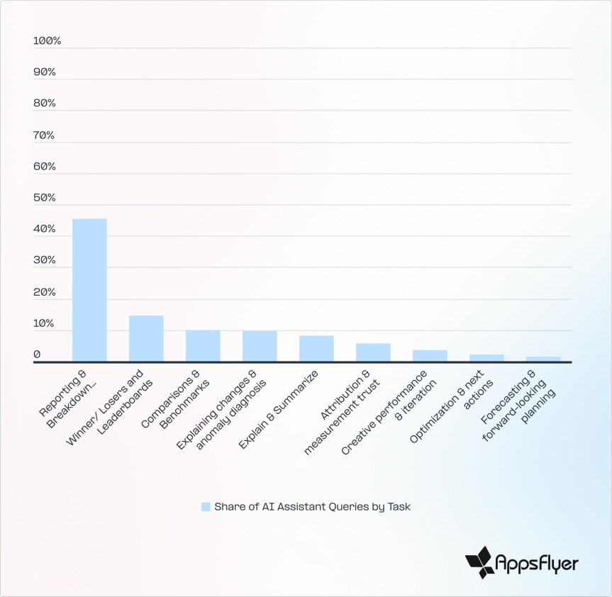 - AI is still used primarily to manage marketing scale, not strategy. With 46% of AI assistant queries focused on reporting and performance breakdowns, teams are using AI to keep pace with rising data volumes rather than replace decision-making, but some genres are already employing more complex tasks and asks.