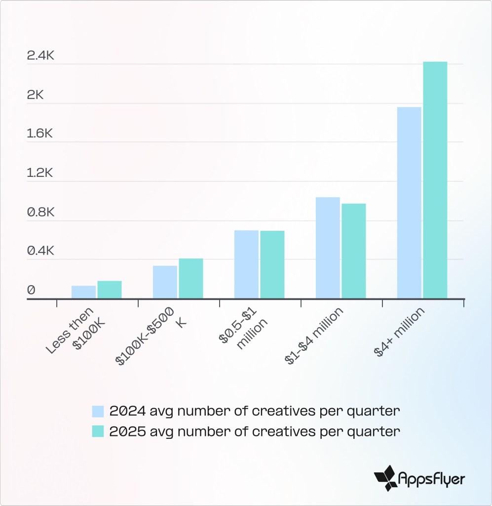 In 2025, AI-enabled production coincided with a sharp increase in advertising across iOS and Android. Creative output scaled rapidly across all spending tiers, with top gaming advertisers producing between 2,400 and 2,600 creative variations per quarter, up 25–30% YoY. That expansion increased pressure on paid acquisition channels. Paid install share rose 10% YoY across iOS and Android, while ad impressions increased 20%, indicating a significant rise in the number of ads competing for the same pool of players. To manage rising marketing volume and fragmentation, AI-enabled tools became a common part of daily workflows with 46% of AI assistant queries focused on reporting and performance breakdowns, reflecting the need for faster visibility as data volumes grew.