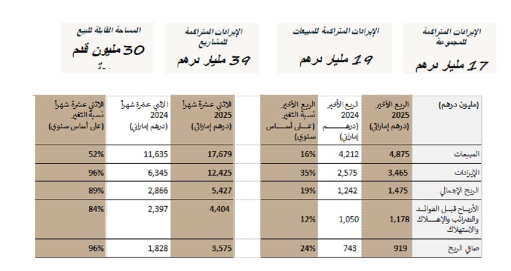 وارتفع صافي الربح بنسبة 96% على أساس سنوي ليصل إلى 3.58 مليار درهم، مدفوعًا بالرافعة التشغيلية القوية، والكفاءة العالية في التنفيذ، واستمرار الطلب القوي على العقارات في دبي.
