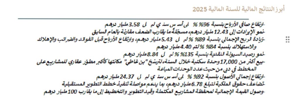 كما سجّلت الإيرادات نموًا يقارب الضعف لتبلغ 12.43 مليار درهم، مقارنةً بـ 6.34 مليار درهم في عام 2024، بدعمٍ من زخم المبيعات، وتسارع عمليات التسليم، والنجاح المستمر لمحفظة “بن غاطي” المتنوعة عبر فئات المشاريع المتوسطة، والرئيسية، والفاخرة، وفائقة الفخامة.