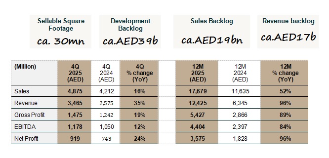Balance sheet strength also continued to improve meaningfully over the year. Total assets rose 92% year-on-year to AED 24.37 billion, reflecting the scale-up of our development activity and the continued expansion of our portfolio, while cash balances increased to AED 8.84 billion, providing a strong liquidity buffer and significant financial flexibility. This leaves us with ample liquidity to continue to execute our market-beating growth strategy whilst maintaining strong financial discipline.”