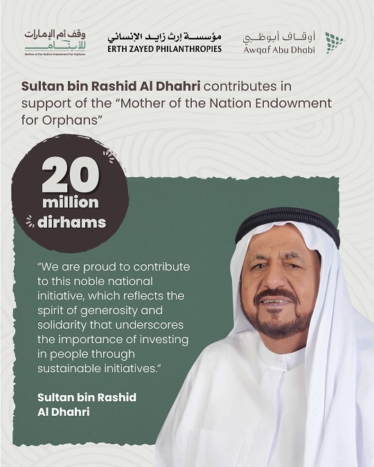 Abu Dhabi, 16 March 2026: Sultan bin Rashid Al Dhahri has contributed AED 20 million in support of the “Mother of the Nation Endowment for Orphans” campaign, launched by the Endowments and Minors’ Funds Authority – Awqaf Abu Dhabi under the patronage of His Highness Sheikh Mohamed bin Zayed Al Nahyan, President of the UAE.